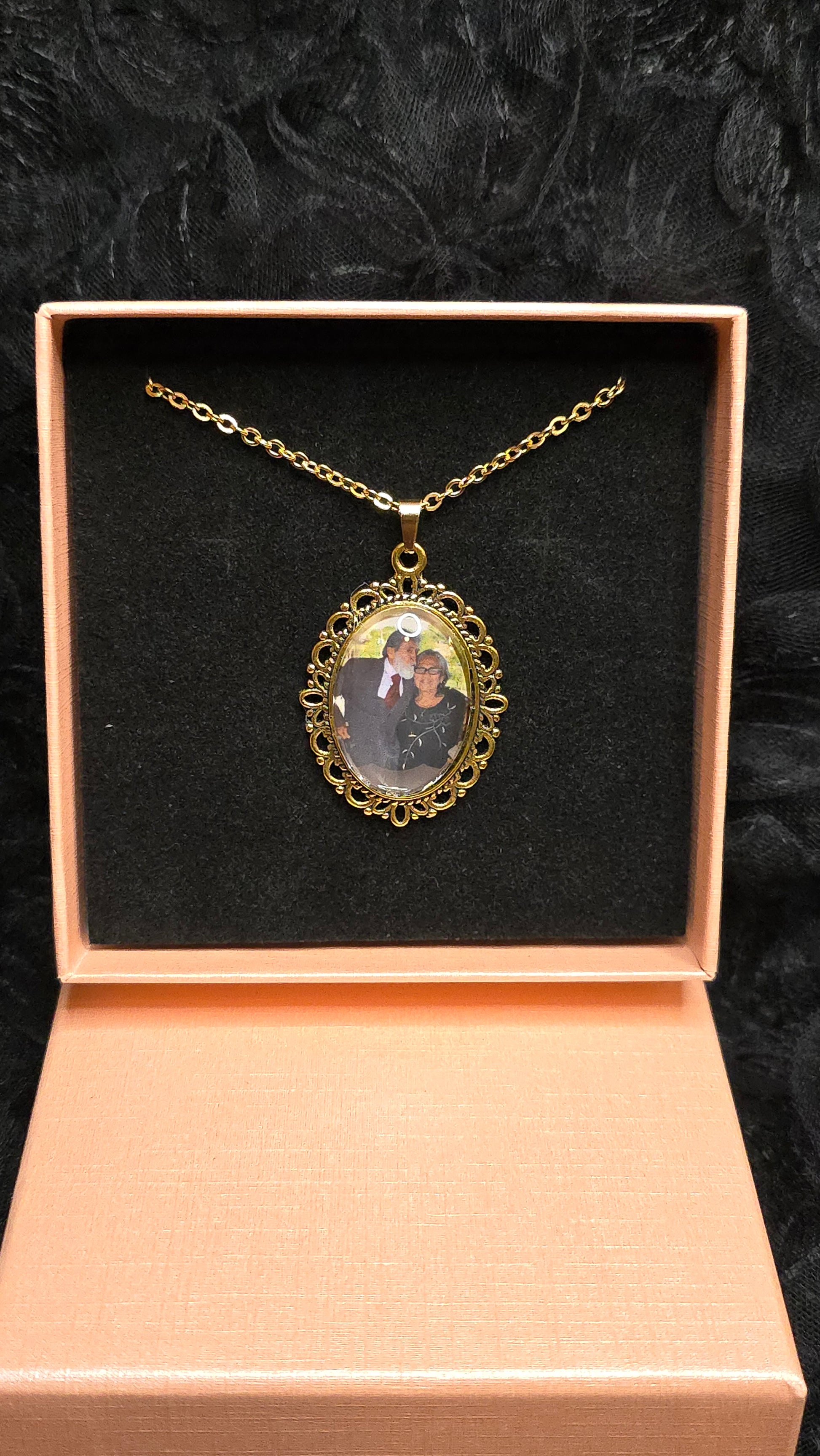 A meaningful, custom-made oval pendant necklace created using your personal photo and sealed beneath a clear glass cabochon. This piece is designed to honor loved ones, celebrate memories, or keep someone special close to your heart.