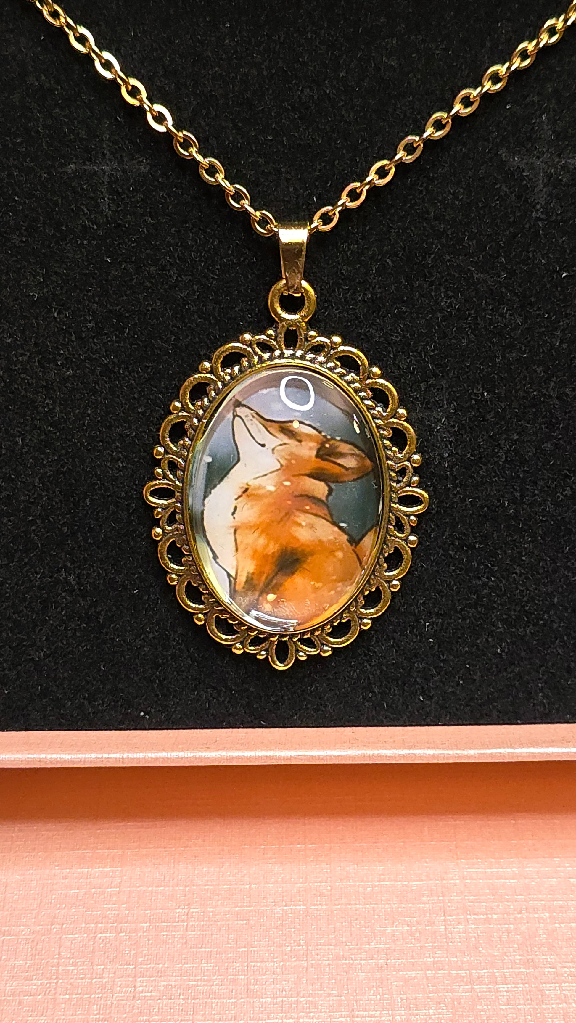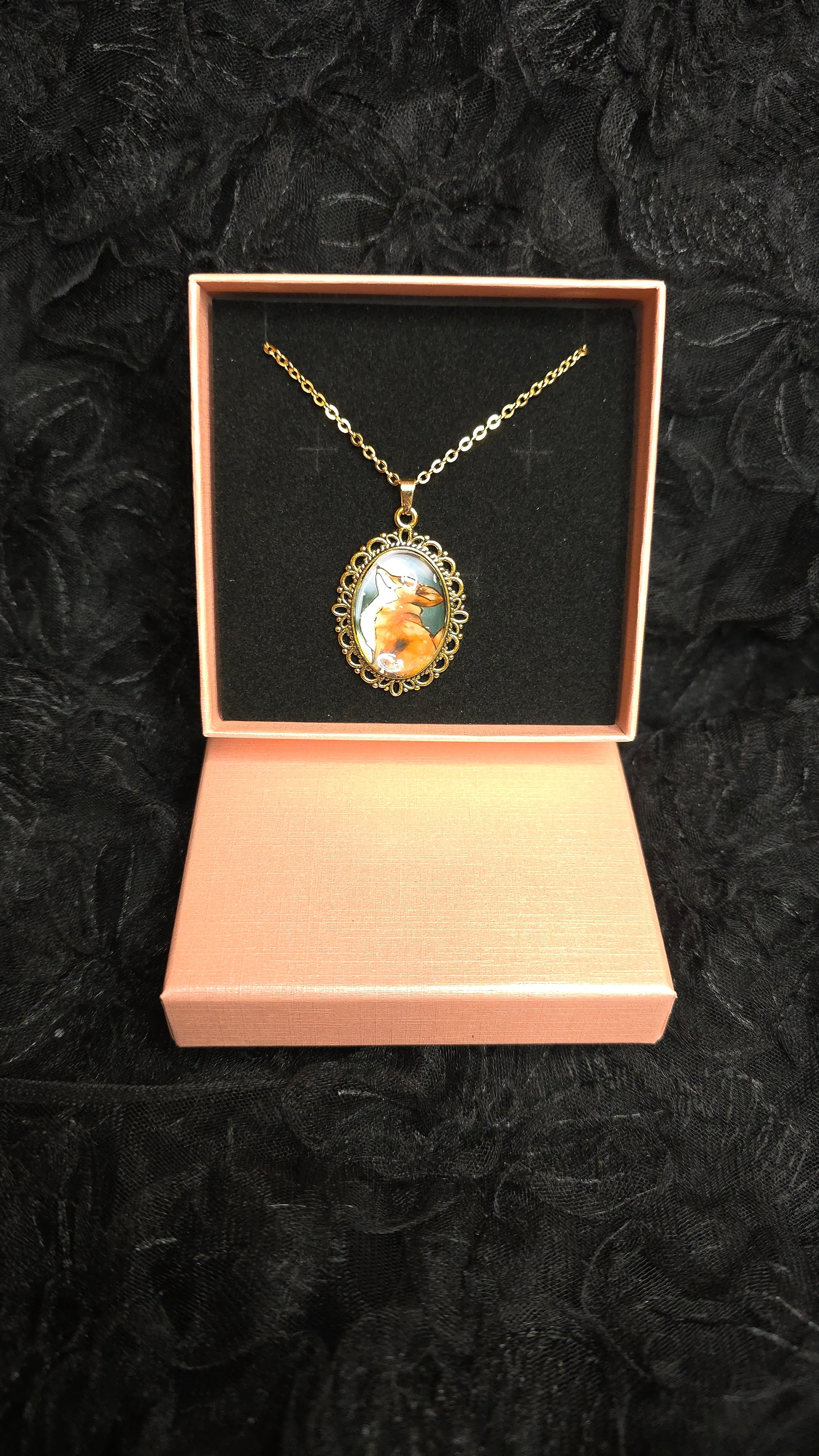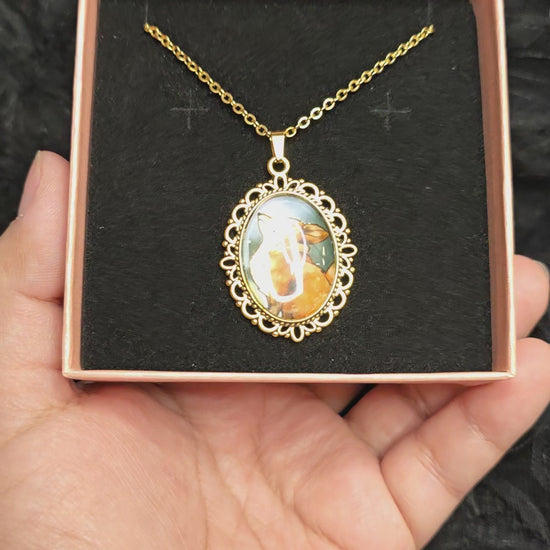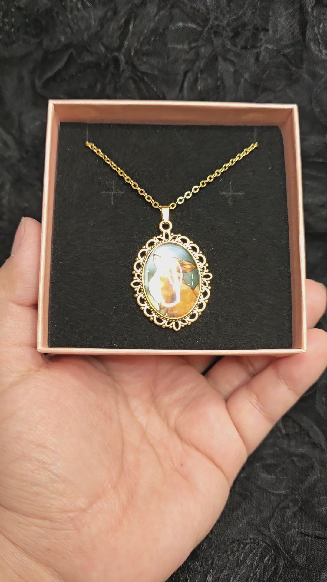 A timeless oval pendant necklace featuring original LAFM Studio artwork, carefully reproduced and sealed beneath a clear glass cabochon. Each piece is hand-assembled, making every necklace a small wearable work of art.