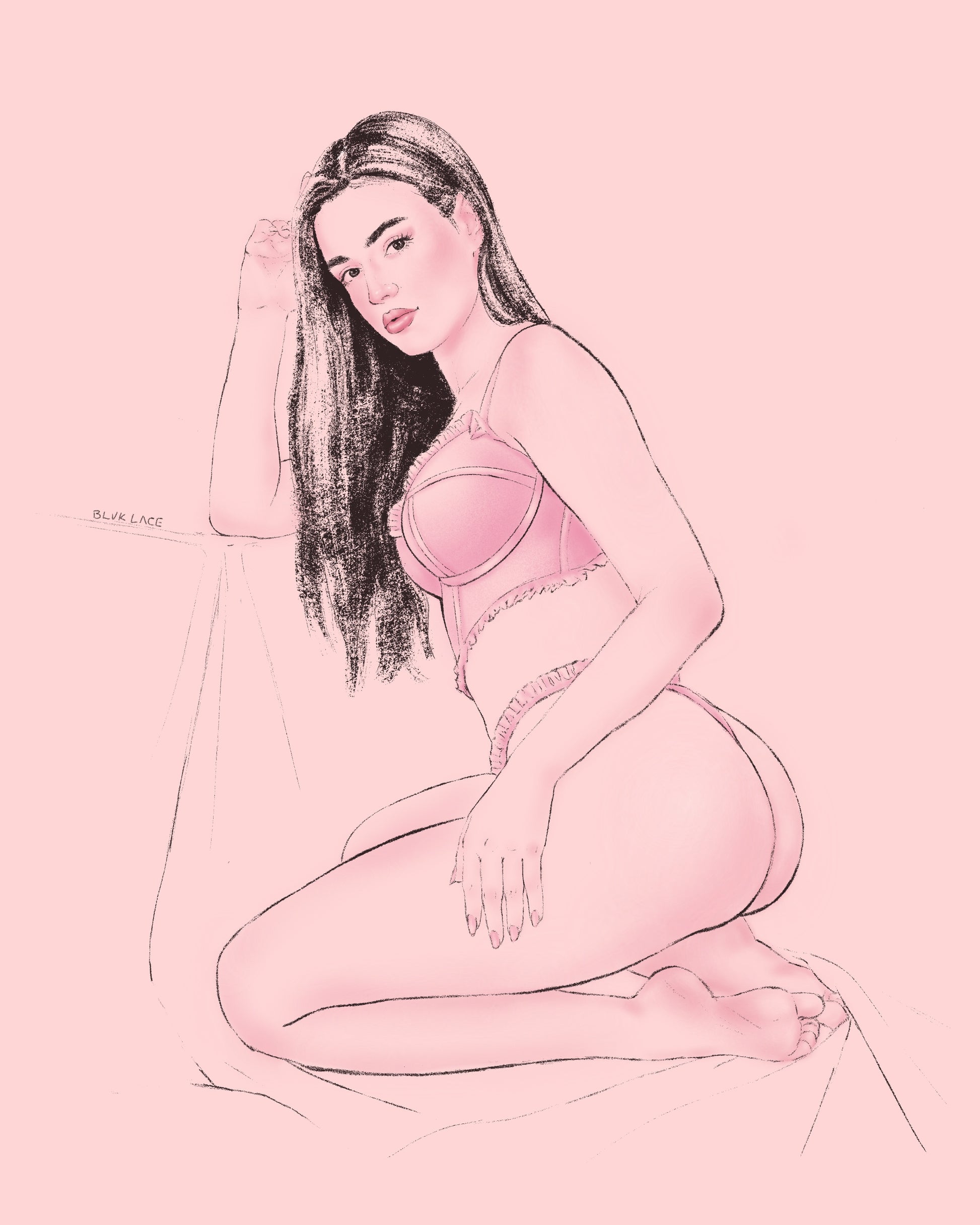 This hand-drawn pinup captures a classic pinup in a relaxing pose.